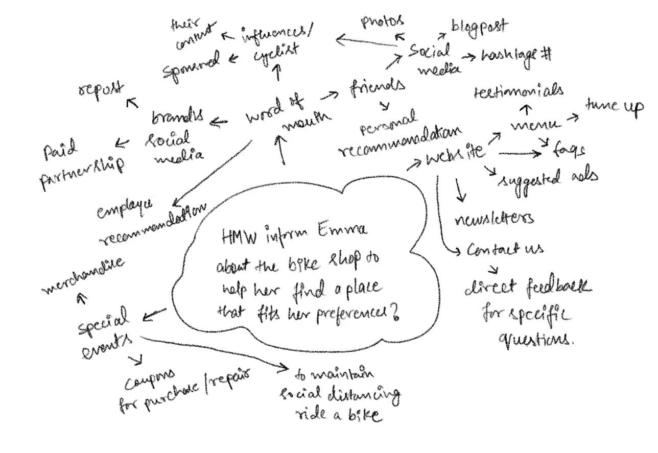 Since I knew what issues we expected to tackle for Emma, I began my brainstorming process to come up with the answers for those issues. I utilized the HMW questions that I recognized and utilized those to assist me with brainstorm various thoughts through mind mapping.