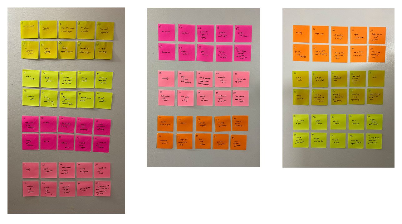 First, I started by categorizing my notes into the categories of Doing, Thinking-Feeling, Seeing, Hearing, Gains, and Pains to get an overall understanding of everything learned during my interviews with the different participants.